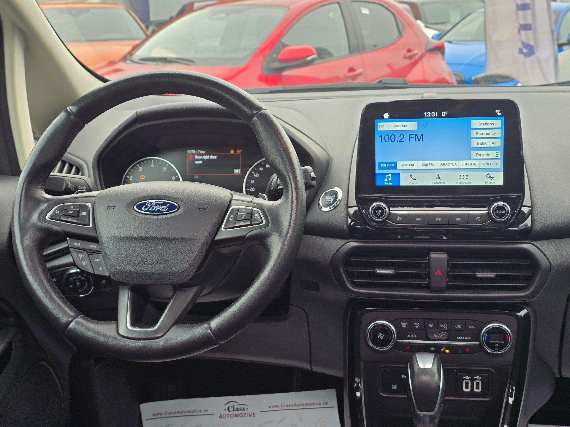 CLASS AUTOMOTIVE – Dealer Auto Rulate Pentru vizualizarea stocului complet accesati www.classautomotive.ro --Experienta 15 ani-- Ford Ecosport 1.0 Ecoboost Titanium 125 CP - Cutie AUTOMATA SERIE SASIU: WF01XXERK1JT62181 ✅Unic Proprietar ✅Istoric Service ✅Garantie 12 Luni ✅Cumparata de noua din Romania ✅Autoturism verificat tehnic ✅KM garantati contractual Pret: 10.990 EUR TVA inclus si nedeductibil Pret finantare: 11.290 EUR TVA inclus si nedeductibil Factura se va emite in lei la cursul de vanzare euro al Bancii Transilvania din data efectuarii platii. Dotari: - Senzori fata/spate - Climatronic - Camera video marsarier - Computer bord - Pilot automat - Scaune fata incalzite - Volan Incalzit - Asistent plecare din rampa - Jante de aliaj - Volan multifunctional imbracat in piele - Android auto si Apple Carplay - Bluetooth, USB - Lumini de zi - Senzor ploaie - Proiectoare ceata - Geamuri electrice fata-spate - Isofix Descrierea autovehicului este strict informativă, pot există greșeli umane de tipar (opțiuni, performanța a motorului, capacitate cilindrică, transmisie etc.) Pentru informatii suplimentare cu privire la opțiunile prezentate, ne puteți contacta telefonic.